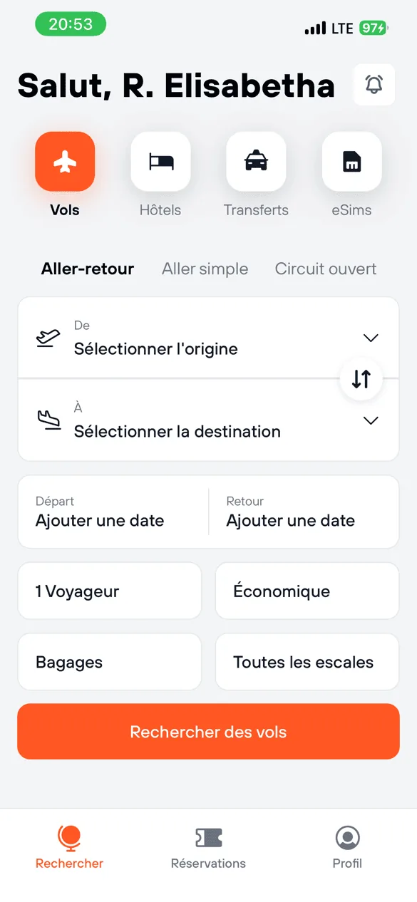 Reservez vols, sejours, transferts et eSIMs depuis une app premium concue pour simplifier chaque voyage.